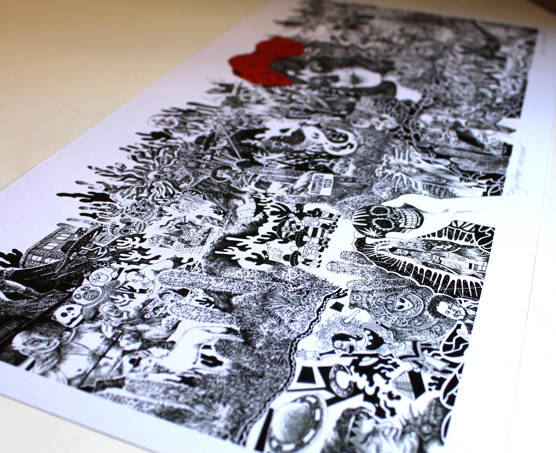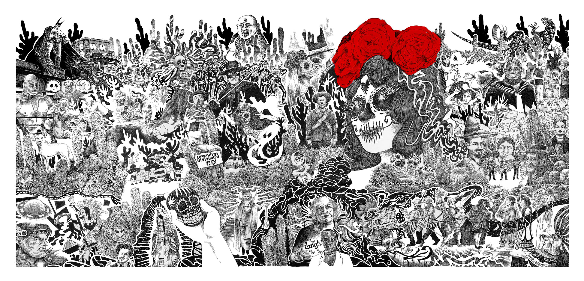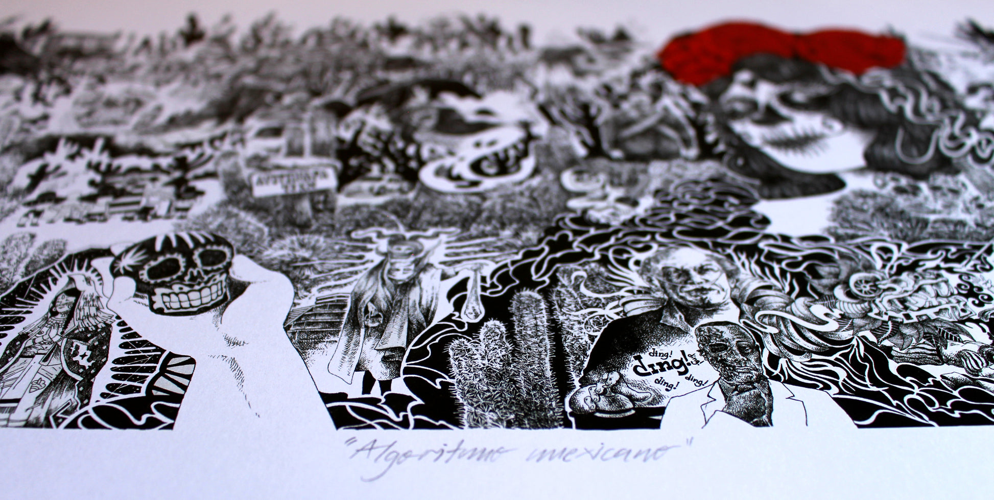 Tengo prints de esta obra que se llama "Algoritmo Mexicano". Es un encargo que me hicieron desde Australia para un restaurante mexicano, en el lienzo se pueden ver varios personajes y situaciones basadas en cultura popular y/o estereotipos de dicho país. Es un dibujo a tinta muy caótico y detallado.
